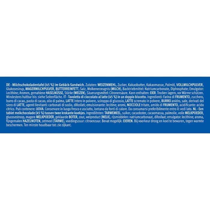Product Name‎Milk chocolate bar (45%) in pastry sandwich, Tavoletta di cioccolato al latte (45%) in a double biscotto