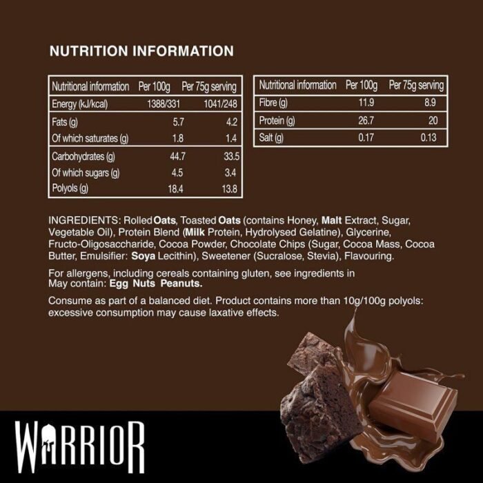 INGREDIENTS: Rolled OATS, Protein Blend (MILK Protein, Hydrolysed Gelatine), Glycerine, Toasted OATS (contains Honey, MALT Extract, Sugar, Vegetable Oil), Fructo-Oligosaccharide, Cocoa Powder, White Chocolate Chips 3.5% (Sugar, Cocoa Mass, Cocoa Butter, Emulsifier: SOY Lecithin), Flavouring, Salt, Sweetener (Sucralose, Stevia). For Allergens, please see ingredients in bold / CAPITALS. May also contain EGG, MILK ,GLUTEN, SOY, NUTS and PEANUTS.